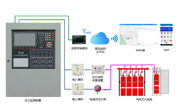 氣體物聯(lián)網(wǎng)主要由壓力信號(hào)采集裝置、輸入模塊、信息傳輸模塊、云平臺(tái)(APP端、Web端)等組成,用以實(shí)現(xiàn)遠(yuǎn)程檢測(cè)氣體滅火系統(tǒng)的儲(chǔ)存壓力。氣體消防鋼瓶作為滅火裝置廣泛用于計(jì)算機(jī)中心機(jī)房、重要的圖書(shū)館檔案館、移動(dòng)通信基站等重要建筑物中。氣體以一定壓力儲(chǔ)存在鋼瓶?jī)?nèi),傳統(tǒng)的氣體鋼瓶在閥門處安裝壓力儀表,需人工按時(shí)巡查鋼瓶的壓力是否正常,壓力數(shù)據(jù)無(wú)法遠(yuǎn)程或?qū)崟r(shí)獲取,從而導(dǎo)致鋼瓶組常常因壓力損失而失去滅火功能。